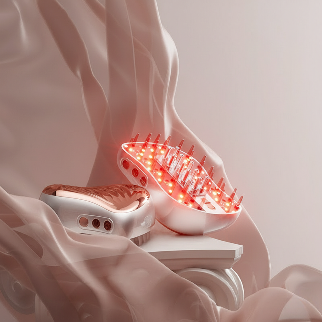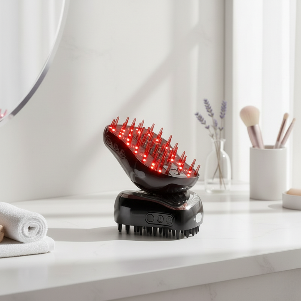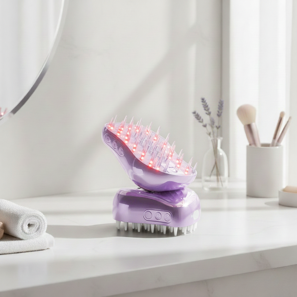 Blue light calms scalp inflammation while micro-vibration improves follicle anchoring, dramatically reducing the daily hair loss that clogs your drain and brush.
